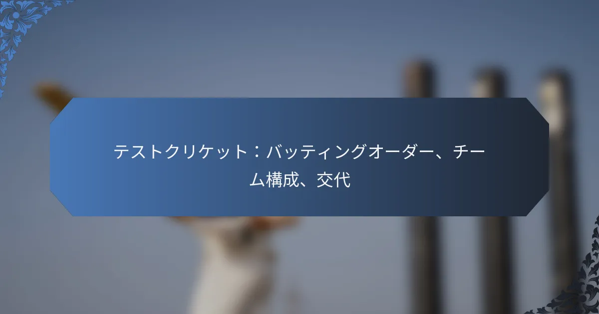 テストクリケットにおいて、バッティングオーダーは重要であり、選手がバッティングする順序を決定し、チームの戦略やパフォーマンスに影響を与えます。チーム構成は、選手の役割、ピッチの状態、フォームに基づいて慎重に作成され、さまざまなシナリオに適応できるバランスの取れたラインアップを目指します。さらに、交代は特定の条件下で許可されており、主に怪我や戦術的調整のために行われ、チームが競争力を維持しながらゲームの整合性を守ることを保証します。 テストクリケットにおけるバッティングオーダーとは何ですか? テストクリケットにおけるバッティングオーダーは、試合中に選手がバッティングする順序を指します。この配置は重要であり、試合全体を通じてチームのパフォーマンスや戦略に大きな影響を与える可能性があります。 バッティングオーダーの定義と重要性 バッティングオーダーは、イニングの異なる段階でバッティングする選手のラインアップを決定します。適切に構成されたオーダーは、チームが得点を最大化し、さまざまな試合状況に適応するのに役立ちます。チームはオーダーを決定する際に、選手の強みと弱みを考慮することが不可欠です。 しっかりとしたバッティングオーダーを持つことは、特にテストクリケットのような長いフォーマットにおいて、チームがイニングの基盤を築くことを可能にします。オープナーは通常、新しいボールに対処し、イニングのプラットフォームを設定します。一方、中堅バッツマンはイニングを安定させ、必要に応じて得点を加速させるために重要です。 オープナーと中堅バッツマンの役割 オープナー:彼らの主な役割は、しっかりとしたスタートを提供し、新しいボールに対処し、イニングのプラットフォームを設定することです。 トップオーダーバッツマン:これらの選手は、イニングの初期から中期にかけてパートナーシップを築き、得点を上げる責任があります。 中堅バッツマン:彼らはしばしば重要な局面で登場し、イニングを安定させたり、必要に応じて得点率を加速させたりする任務を負います。 ローワーオーダーバッツマン:通常、これらの選手は少ない得点を期待されますが、テールエンドのパートナーシップにおいて重要な役割を果たすことがあります。 バッティングオーダーの決定に影響を与える要因 テストクリケットにおけるバッティングオーダーには、選手のフォーム、ピッチの状態、試合状況など、いくつかの要因が影響します。コーチやキャプテンは、選手の強みを相手のボウリング攻撃と比較して評価する必要があります。 さらに、ピッチの性質は、攻撃的なバッツマンを送るべきか、より守備的な選手を送るべきかを決定する要因となります。たとえば、グリーンピッチでは慎重なアプローチが求められるかもしれませんが、フラットピッチではより攻撃的なバッティングオーダーが許されるかもしれません。 効果的なバッティングオーダーの歴史的例 チーム 年 著名なオープナー 中堅バッツマン オーストラリア 2000年代 ジャスティン・ランガー、マシュー・ヘイデン リッキー・ポンティング、ダミアン・マーチン インド 2000年代 ビレンダー・セワグ、ガウタム・ガンビール ソーラブ・ガンギリ、ラフール・ドラビッド イングランド 2010年代 アラスター・クック、ニック・コンプトン ジョー・ルート、ベン・ストークス バッティングオーダーのパフォーマンスに関する統計 パフォーマンス統計は、バッティングオーダーが試合結果に与える影響を明らかにします。オープナーは通常、ローワーオーダーバッツマンと比較してイニングあたりの得点が高い傾向があり、イニングのトーンを設定する役割を強調しています。 中堅バッツマンは、ポジションに応じて異なる平均を持ち、通常、3番でバッティングする選手は得点の機会が多くなります。これらの統計を分析することで、チームはより良い結果を得るためにバッティングオーダーを洗練させることができます。 テストクリケットにおけるチーム構成はどのように決定されるのか? テストクリケットにおけるチーム構成は、選手の役割、ピッチの状態、現在のフォームの組み合わせによって決まります。目標は、さまざまな試合状況や条件に適応できるバランスの取れたチームを作成し、成功の可能性を最大化することです。 テストクリケットチームの主要な役割 テストクリケットチームは通常、専門のバッツマン、ボウラー、オールラウンダーで構成され、それぞれが特定の役割を果たします。バッツマンは得点を上げる責任があり、ボウラーは相手のバッツマンをアウトにすることを目指します。オールラウンダーは両方の分野で貢献し、チーム構成に柔軟性を提供します。 これらのカテゴリ内には、オープナー、中堅バッツマン、速球投手、スピナーなどの特定の役割があります。オープナーはイニングのトーンを設定し、中堅バッツマ